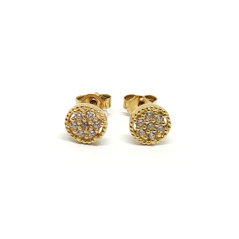 Topos en oro 18K, forma de Mándala con circones blancos y broche de seguridad. peso 1.68 Gramos
